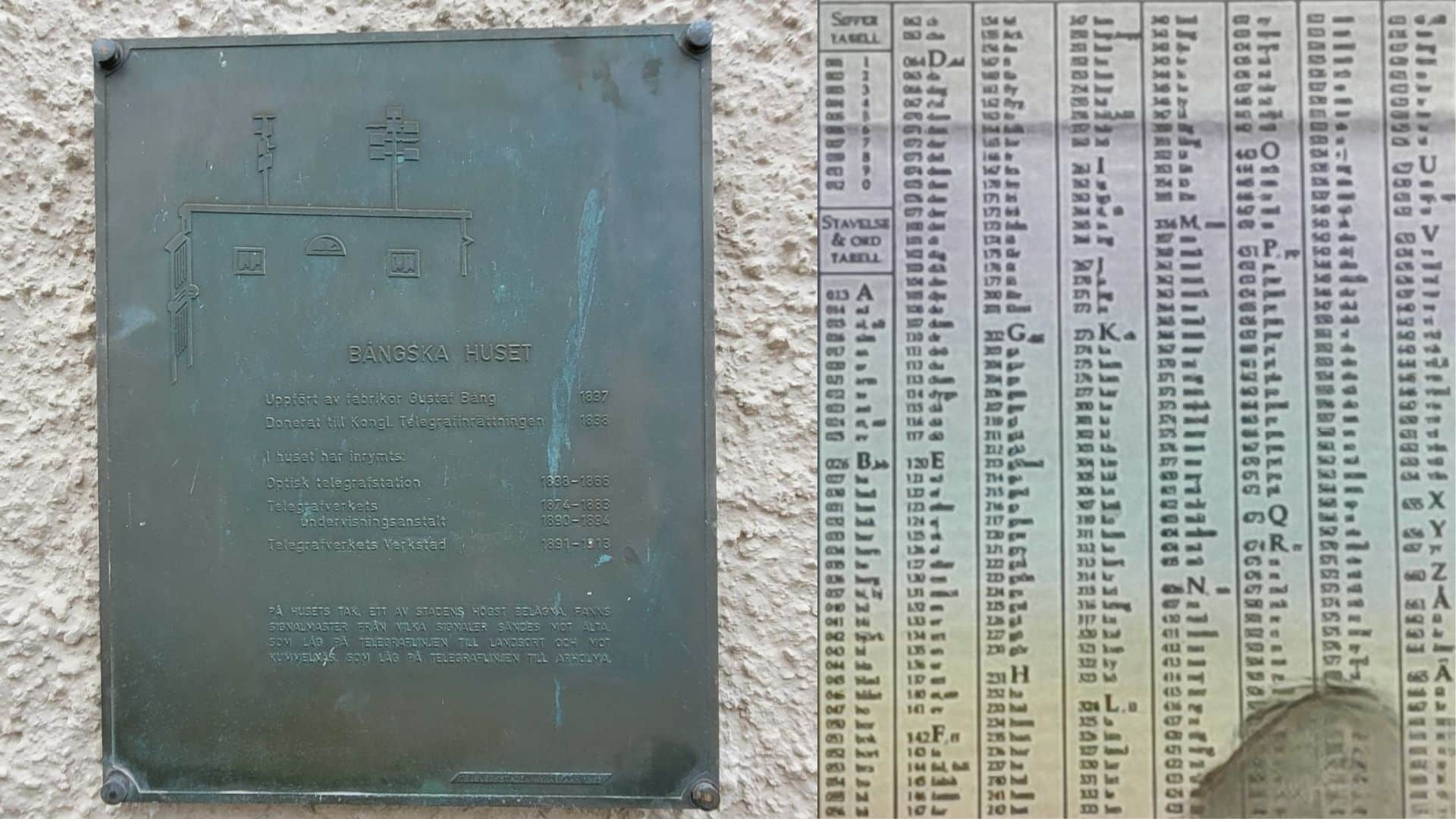 Minnesplakett på fasaden som visar Bångska huset med Edelcrantz optiska telegraf samt telegrafisternas signaltabell med bokstavs- och sifferkombinationer för att skapa meddelanden.